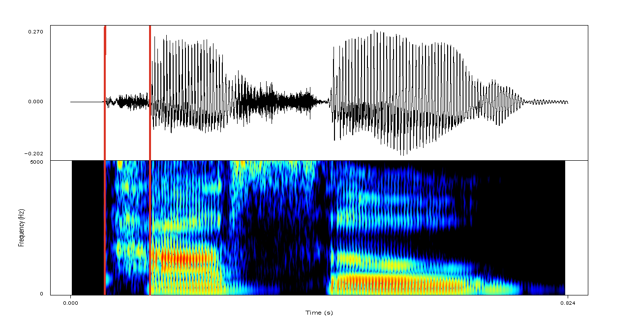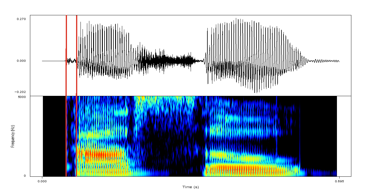 Input was the primary driver of better perceptual accuracy, which then translated into more native-like production. For example, the panels show a learner producing paso “step” before and after training. In the right panel (pre-training), the burst release (first red line) is followed by a longer lag before voicing begins, indicating English-like aspiration. In the left panel (post-training), the lag between burst and voicing is much shorter, reflecting a more Spanish-like VOT with reduced aspiration. This tighter timing shows how increased input helps learners retune their phonetic targets toward Spanish norms.